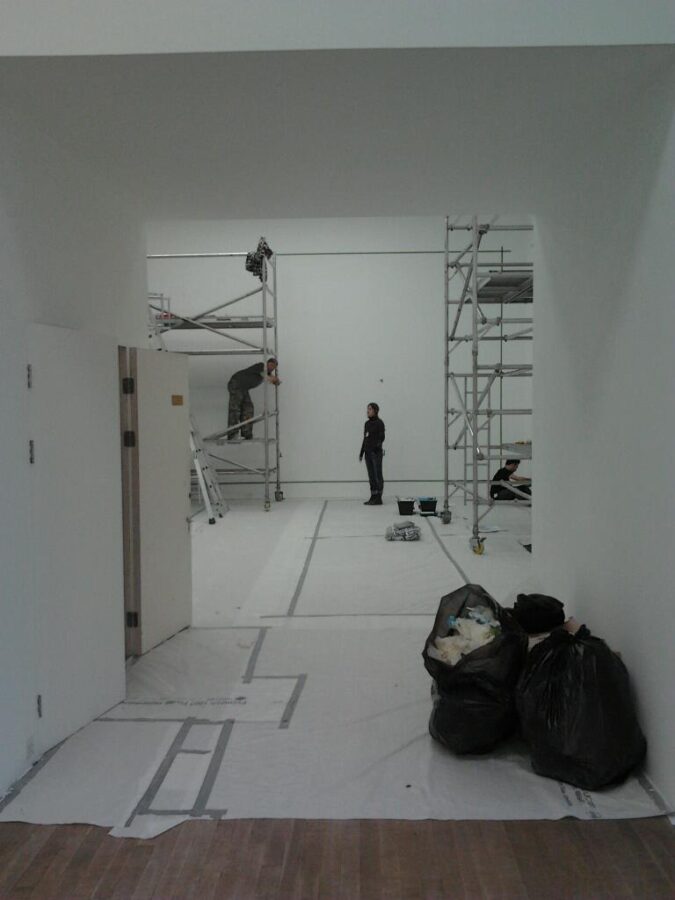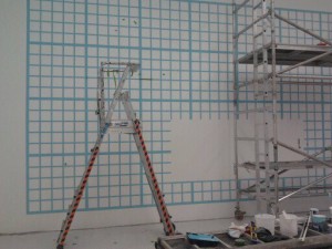 The first job today was to trim out marker ports from the layout so that the drawing acted as a ‘key-line’ guide: no carbon paper or chalk trace-off for this job as the Dulux Brilliant White matt wall surface needed to remain spotless. How happy I was that the Tate would be using Dulux, as it has sweet membrane surface and some extra flow medium added for a smooth finish. All valuable help in the big picture.