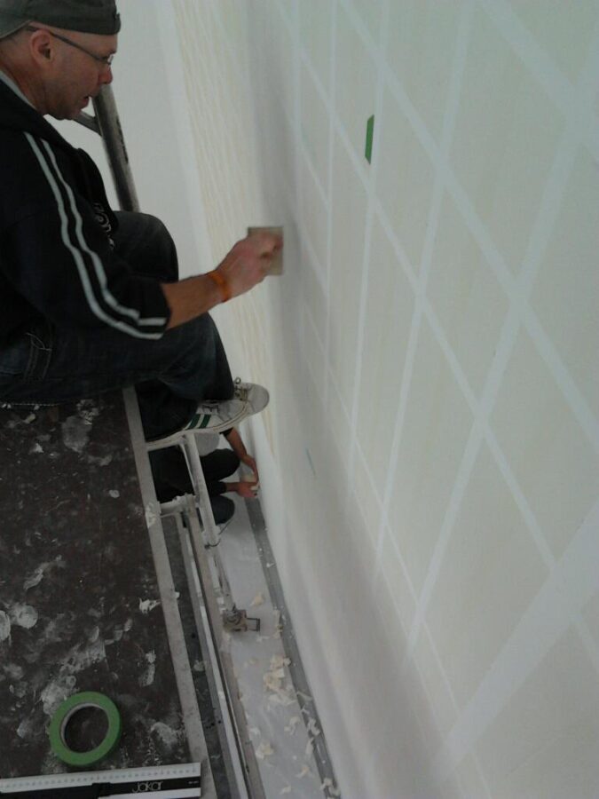 The walls were out. They looked like plaster but were actually MDF constructed erected on alloy frames. They dipped and buckled causing the horizontal layout to float and liquefy almost across the uneven surface. Our first mark-out had wanders of up to 4mm.